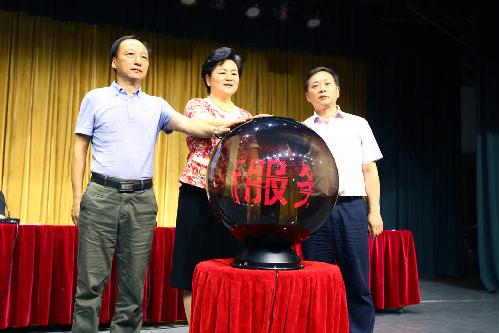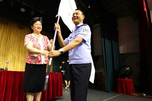 市人大常委会副主任、市总工会主席、党组书记葛玉琴为市劳模志愿服务队授旗