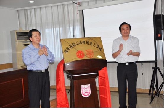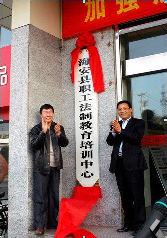 原司法部法制宣传司副司长姜金方(左)南通市政法委书记陈斌(右)为县职工法制教育培训中心揭牌