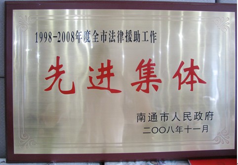 2008年11月市总工会法律援助工作荣获南通市人民政府授予为1998-2008年法律援助工作先进集体。