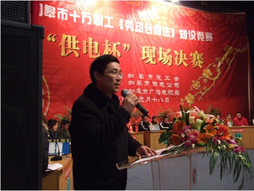 2008年1月市总工会组织了十万职工《劳动合同法》知识竞赛系列,图为市委常委、市委组织部部长张辉知识竞赛现场讲话。